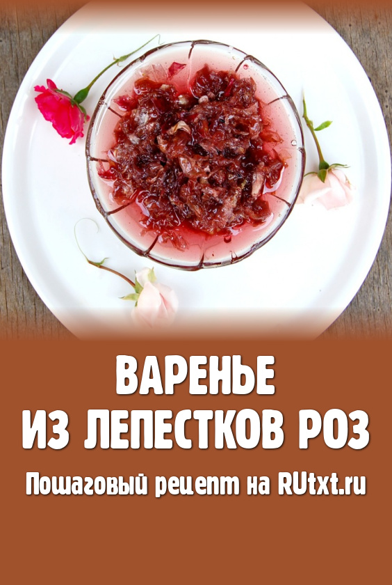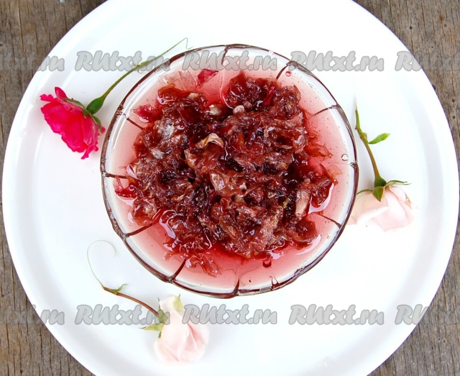 Таким образом, варенье варится в три захода: сразу после заливания воды и добавления сахара, затем через 2 часа после остывания и в третий раз - через - 1-2 часа после второго раза. Готовое варенье разложить по баночкам и вазочкам. Из указанного количества ингредиентов получается одна 800-граммовая баночка готового варенья. Варенье из лепестков роз получается достаточно густым, особенно после остывания.