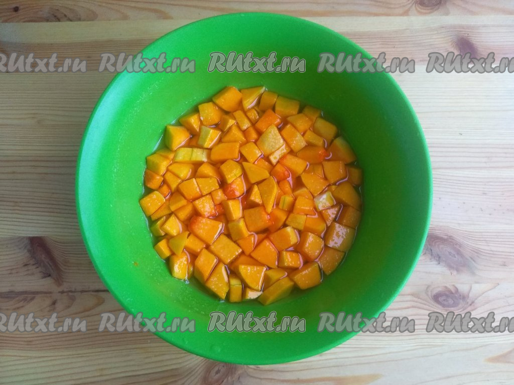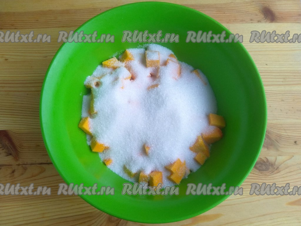 Засыпать тыквенные кубики сахаром и оставить на 4-5 часов при комнатной температуре.