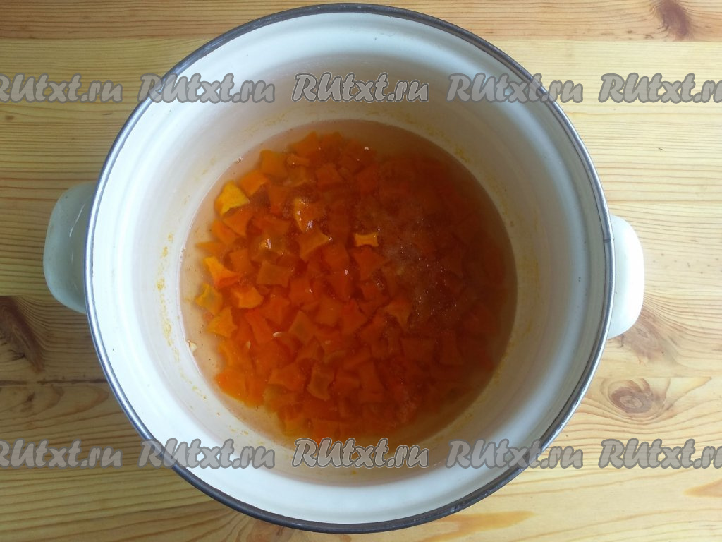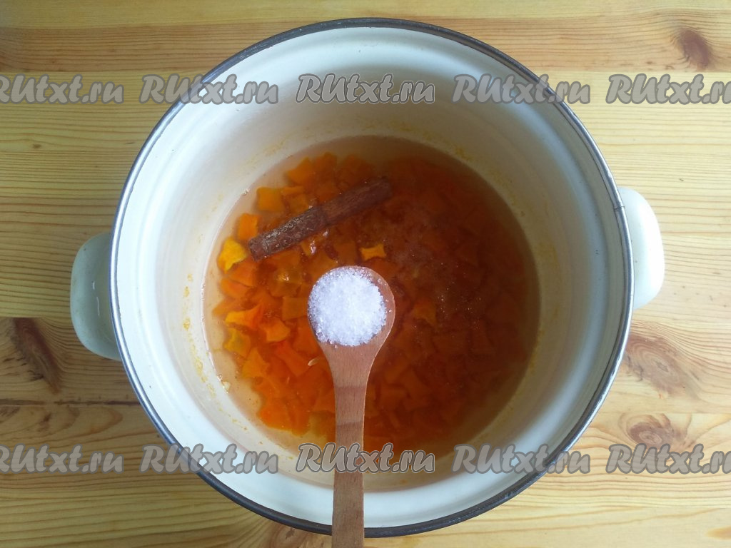 Тыкву вместе с выделившимся соком переложить в кастрюлю, поставить на минимальный огонь, довести до кипения и варить 5 минут на медленном огне, затем снять с огня. Оставить тыкву в сиропе на 12 часов.