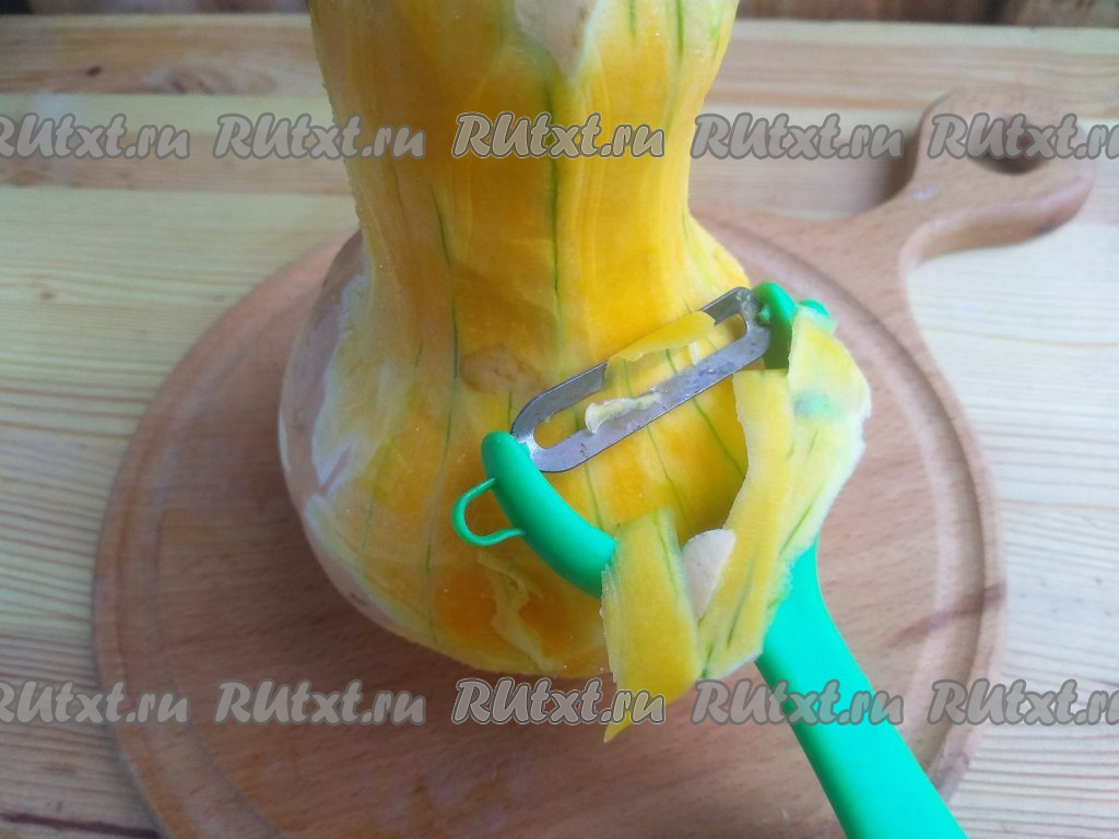Тыкву обмыть в проточной воде, обсушить с помощью полотенца. Очистить тыкву от кожуры (я очищаю с помощью специального ножа), разрезать пополам, удалить семечки и внутреннюю мякоть.