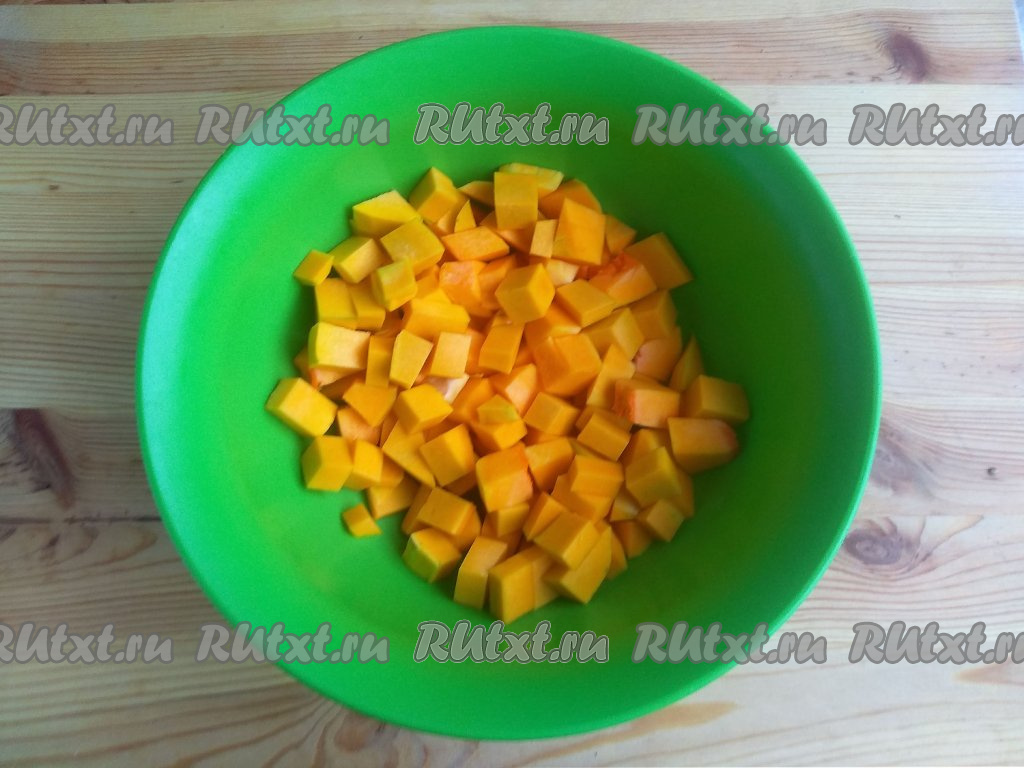 400 грамм очищенной тыквы нарезать на кубики размером 0,8-1 см и выложить в миску.