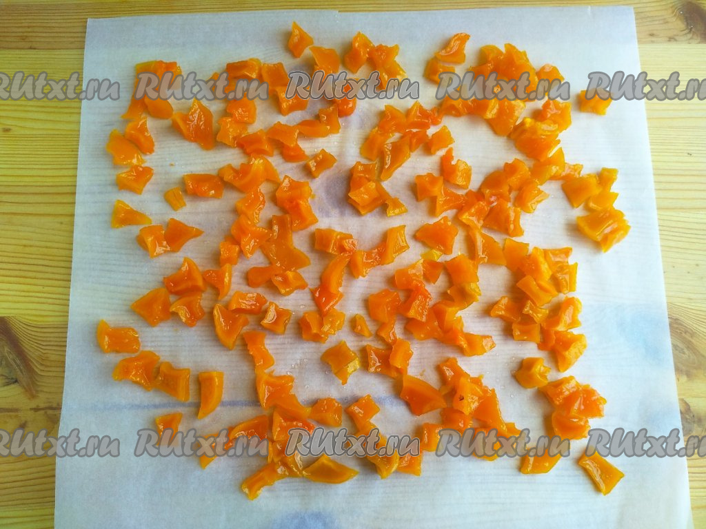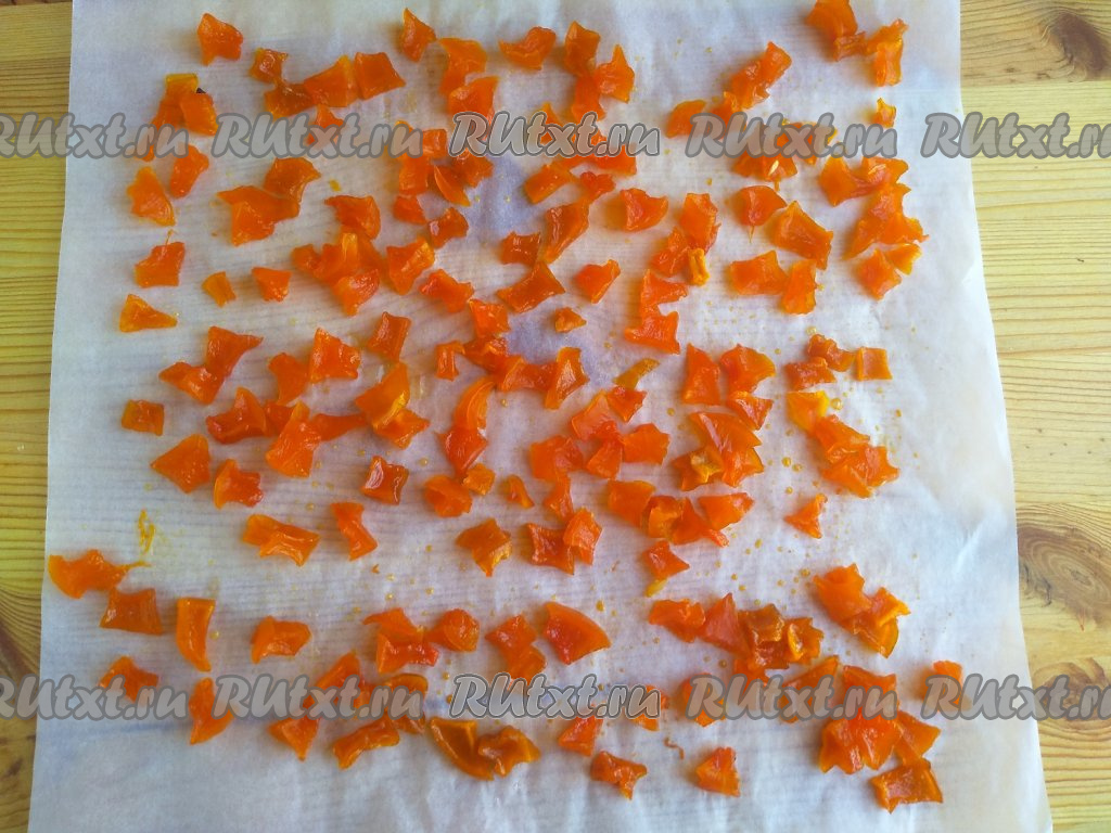 Выложить тыквенные кубики на пергаментную бумагу. Сушить тыквенные цукаты в духовке (если есть функция "Конвекция", включите её) при температуре 100 градусов около 2-3 часов.