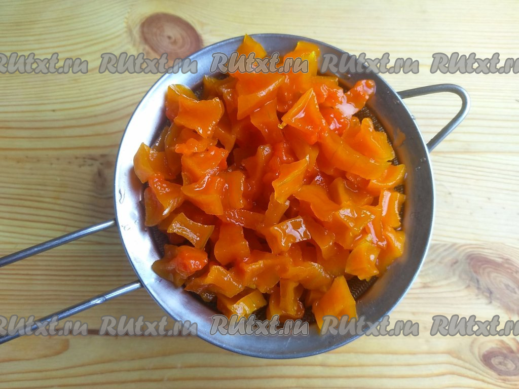 Остывшую тыкву в сиропе выложить на сито, под сито поставить кастрюльку, в которую и будет сливаться сироп. Оставить тыкву в сите на несколько минут, чтобы стёк сироп (сироп в дальнейшем для приготовления цукатов не понадобится, его можно использовать для поливки сырников или блинчиков).