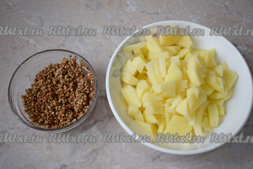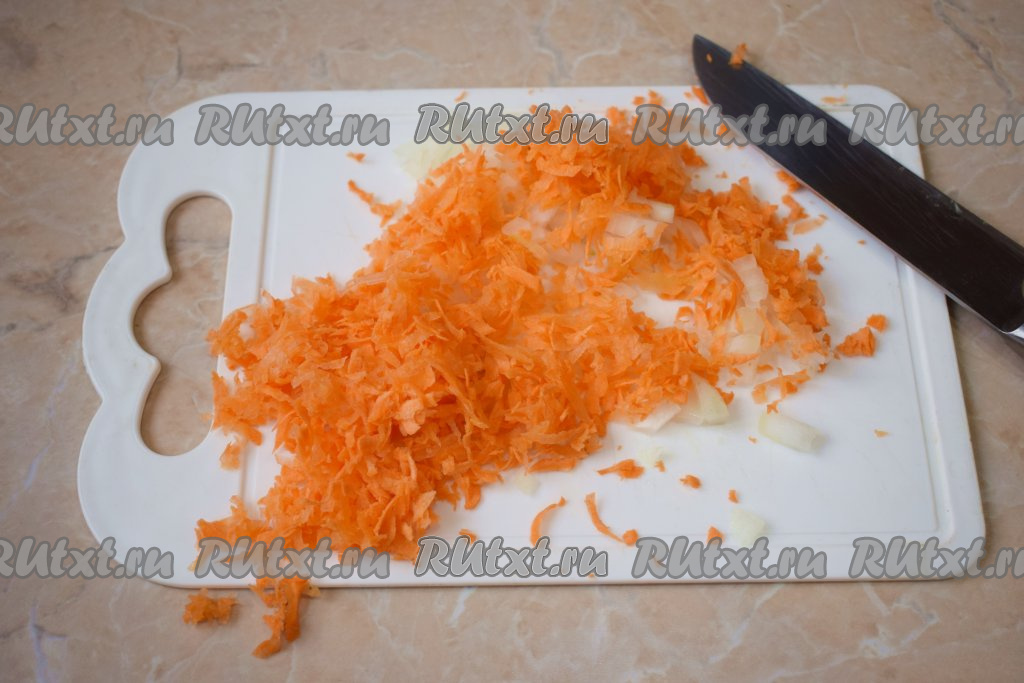 Пока варится картофель и гречка, займитесь овощами. Очистите лук и морковь. Лук мелко нарежьте, а морковь натрите на тёрке.