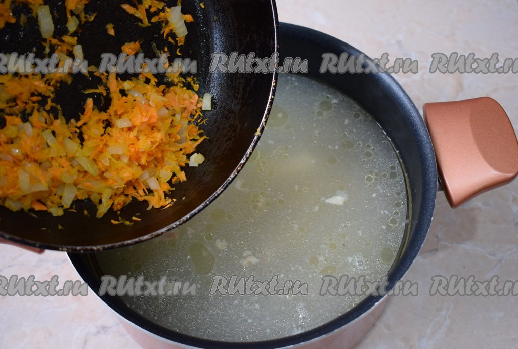 Затем переложите обжаренные овощи в куриный суп с гречкой и картошкой.
