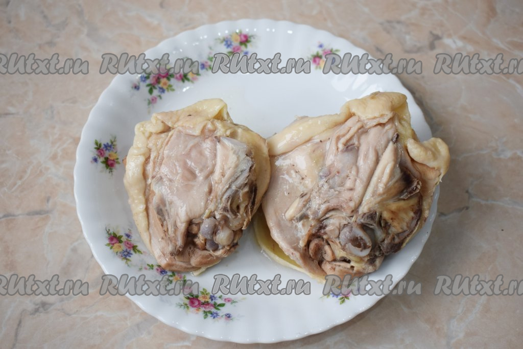 Для приготовления куриного супа можно использовать любые части курицы (я использовала куриные бёдра). Залейте кусочки куриного мяса 2 литрами воды, поставьте на огонь и доведите до кипения. При закипании будет появляться пенка, которую необходимо снять. Проварите курицу с момента закипания в течение 30-40 минут на медленном огне.
