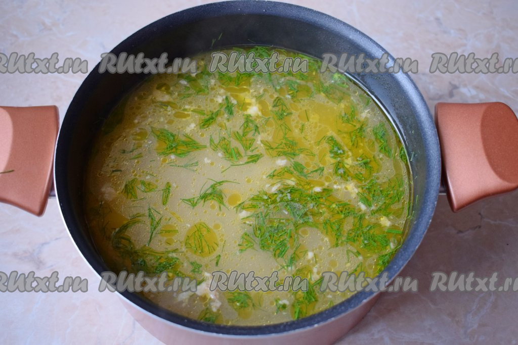 Дайте супу закипеть и проварите на небольшом огне 3-5 минут. По вкусу добавьте соль и специй. Мне очень нравится в супе аромат свежей зелени, поэтому я добавляю немного измельчённого укропа в конце варки. Готовый суп снимите с огня, накройте крышкой и дайте ему постоять минут 5-10.