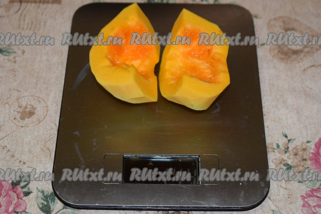 Для начала отрежем от тыквы кусочек, очистим его от кожицы, семян и волокон. Вес очищенной тыквы должен быть, примерно, 140-150 грамм.