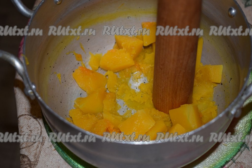 Далее сливаем воду и разминаем тыкву в пюре погружным блендером (или толкушкой). Даём тыквенному пюре остыть.