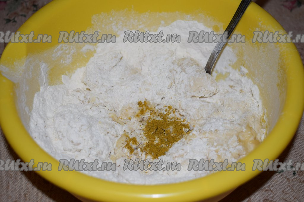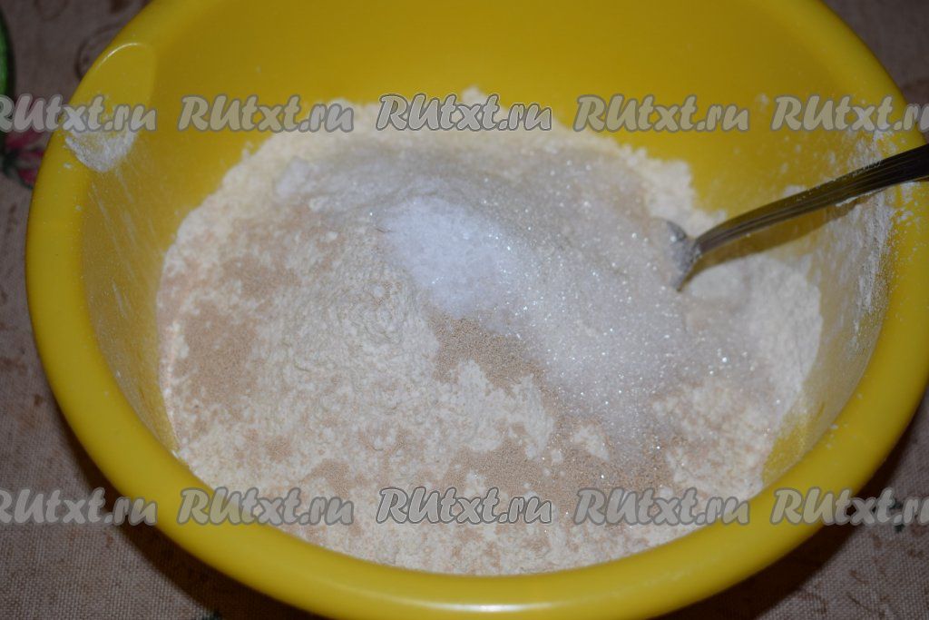 Начинаем замешивать тесто, для этого в миску насыпаем муку, соль, сахар, сухие дрожжи и перемешиваем до однородности.