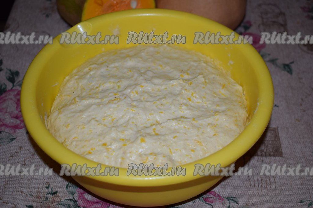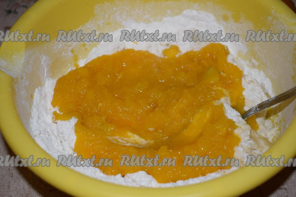 Добавляем в миску остывшее тыквенное пюре и начинаем замешивать тесто.