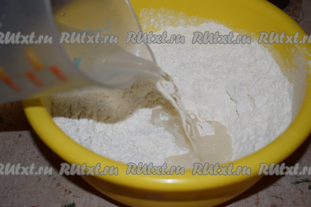 Вливаем в миску тёплую (около 40 градусов) воду. Добавляем растительное масло, перемешиваем.