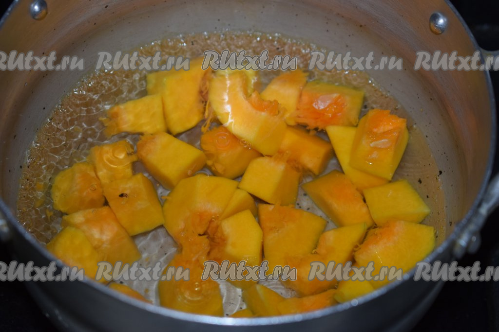 Тыкву нарезаем на небольшие кусочки. Отправляем кусочки тыквы в кастрюлю, добавляем воду так, чтобы она полностью покрыла нашу тыкву.