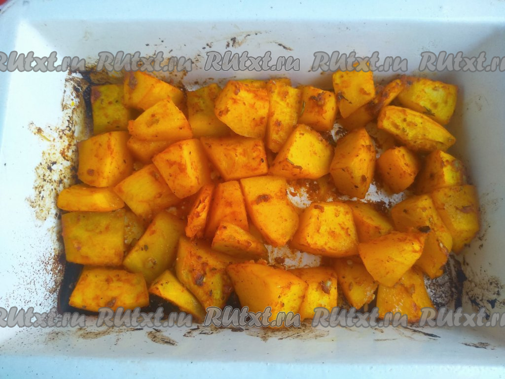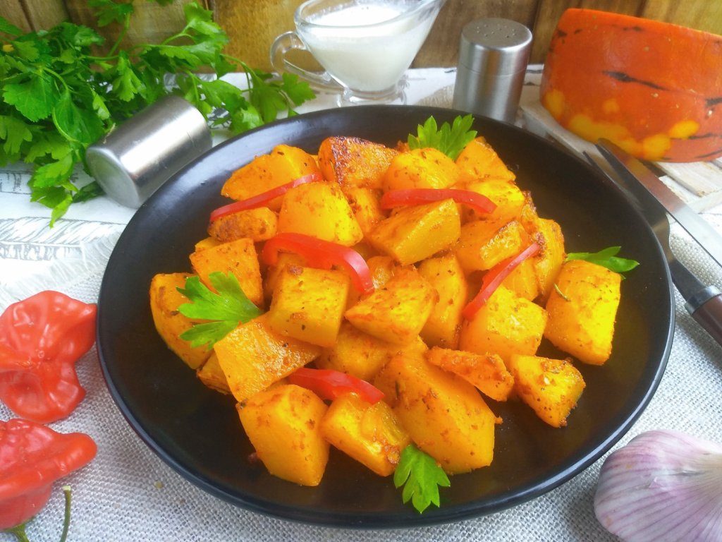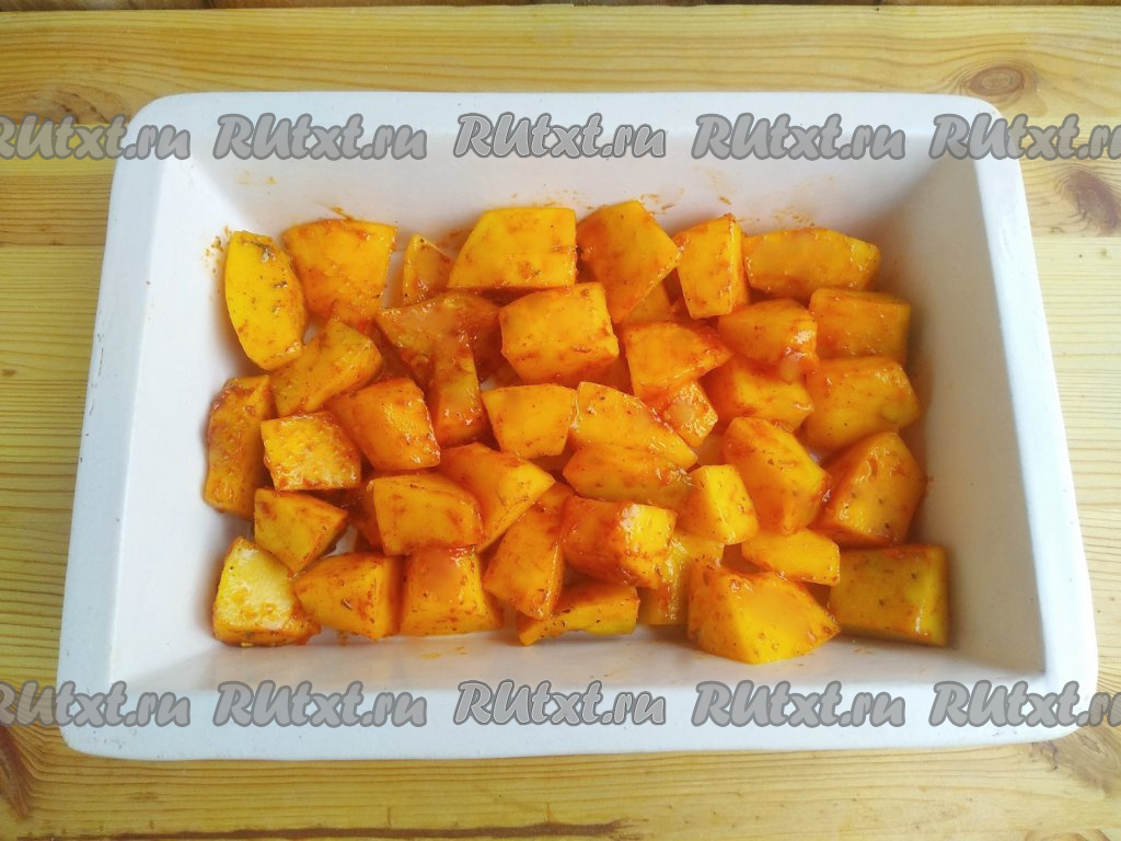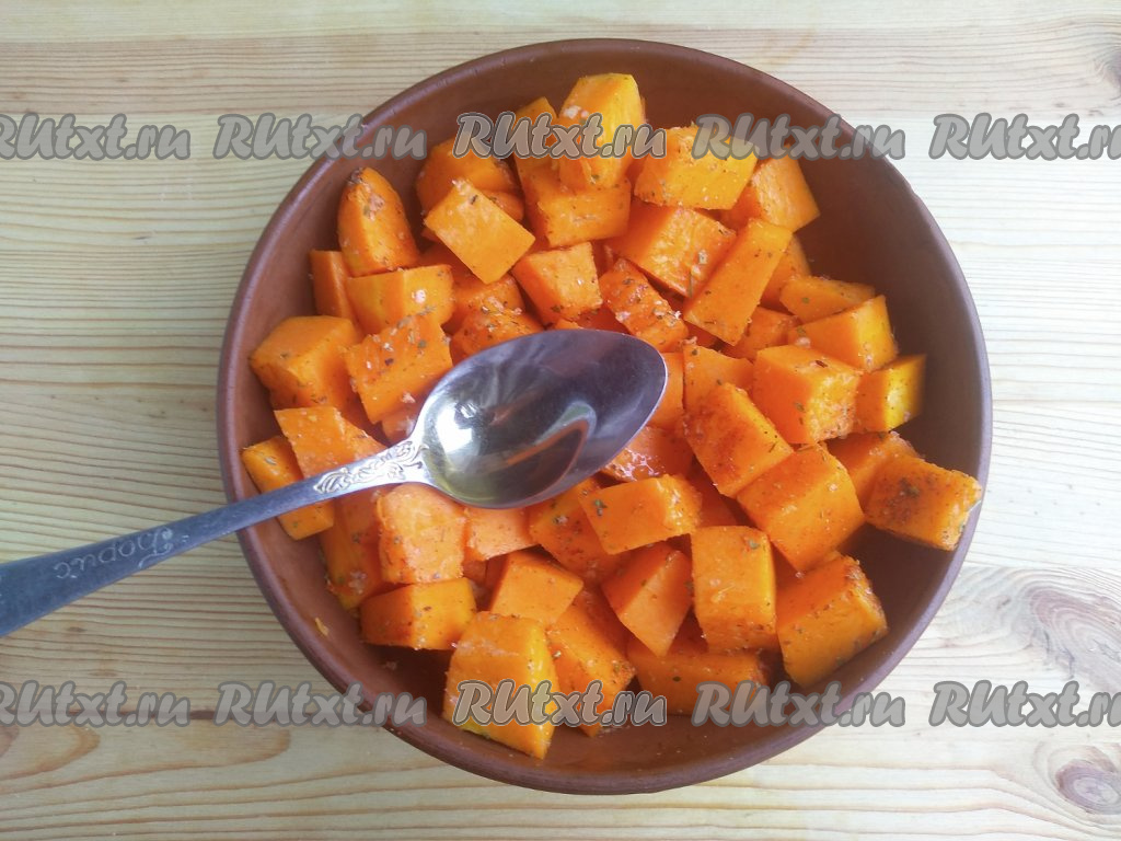 К кусочкам тыквы добавить специи по вкусу (я добавила хмели-сунели, кориандр, шафран и копчёную паприку).
