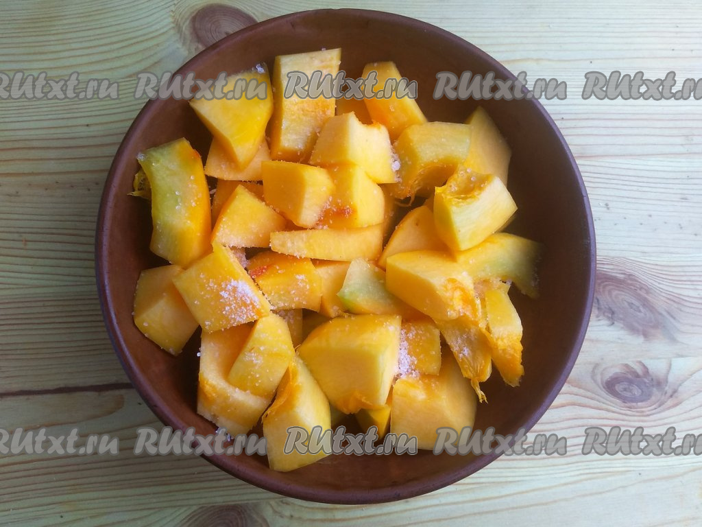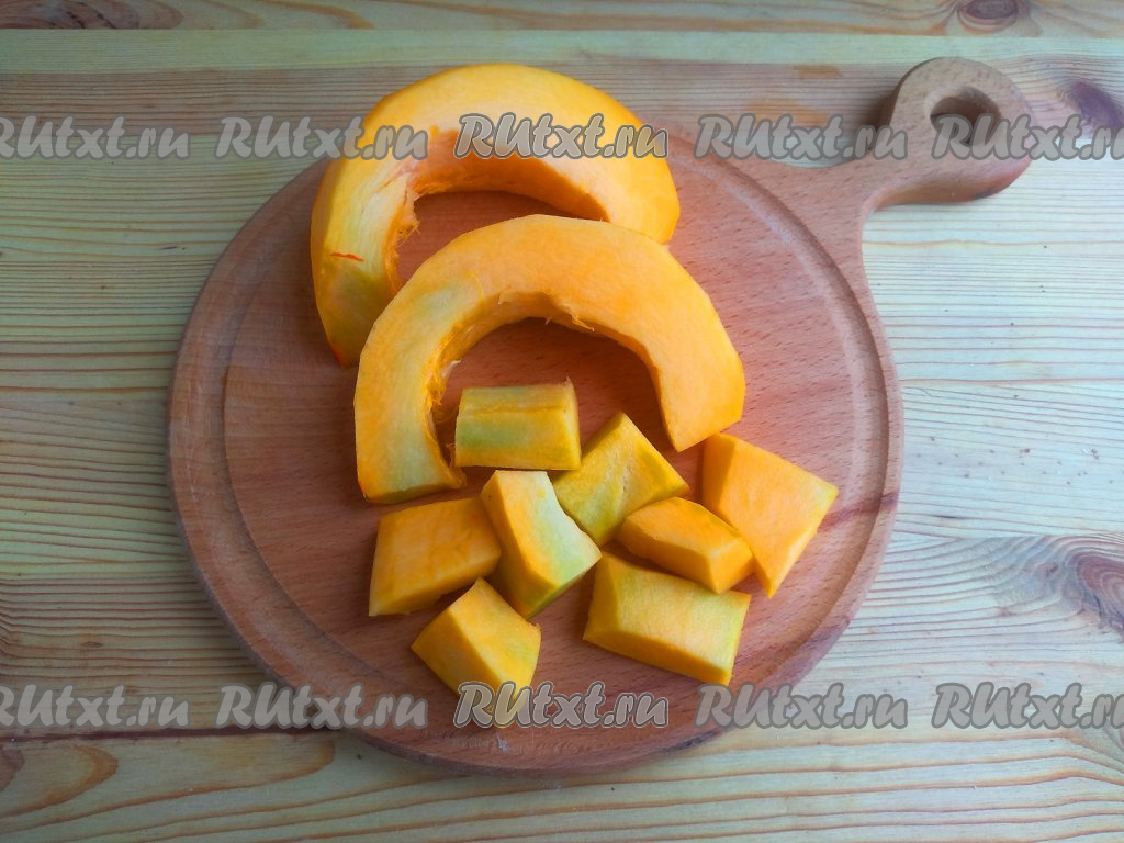 350 грамм тыквы, очищенной от семечек и кожуры, нарезать на ломтики толщиной 1 см. Получившиеся ломтики нарезать на небольшие кусочки одинакового размера.