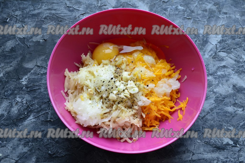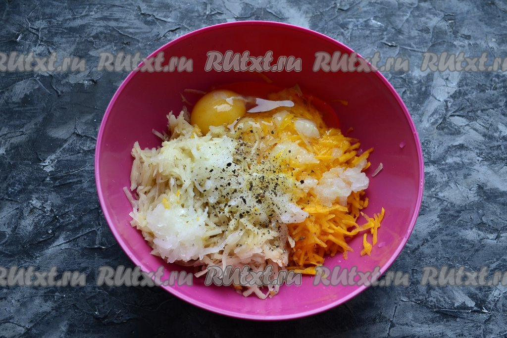 К картошке с тыквой добавить очищенный и натёртый на крупной тёрке лук, а также чёрный молотый перец, сырое яйцо и соль.