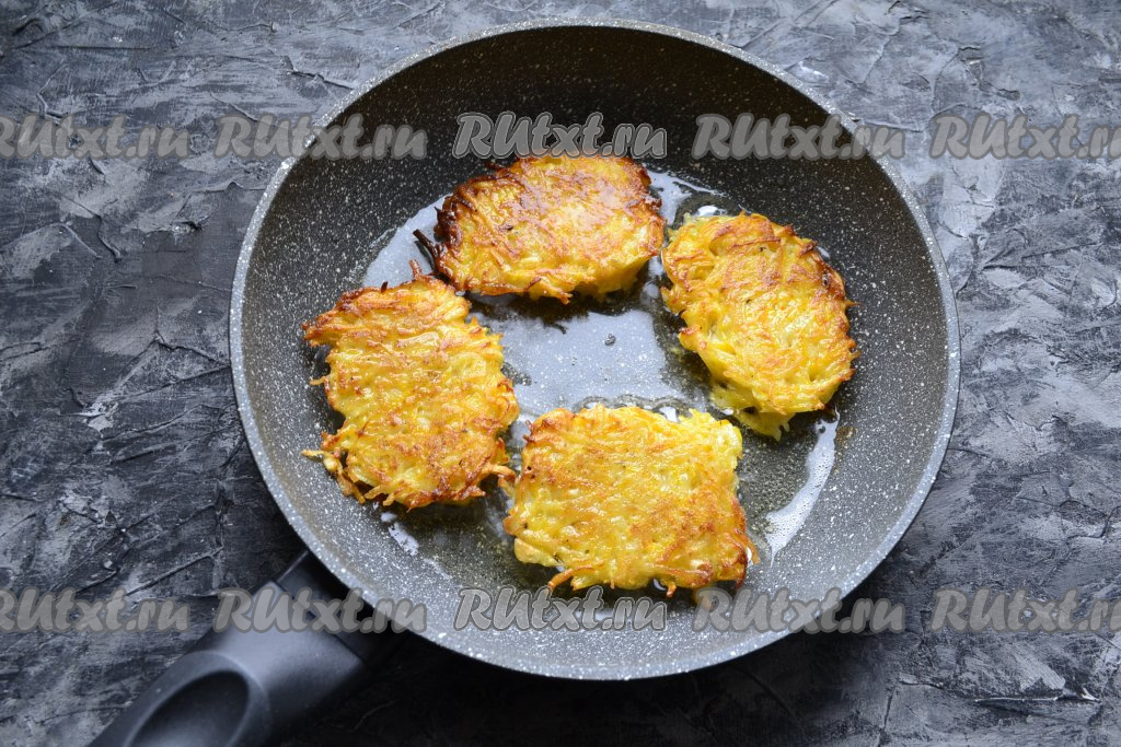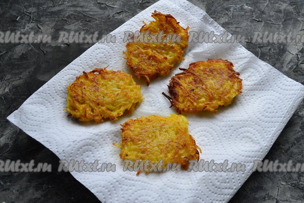 Для того чтобы убрать лишнее масло, готовые драники перекладывать со сковороды на бумажное полотенце. А из оставшейся массы пожарить все драники.