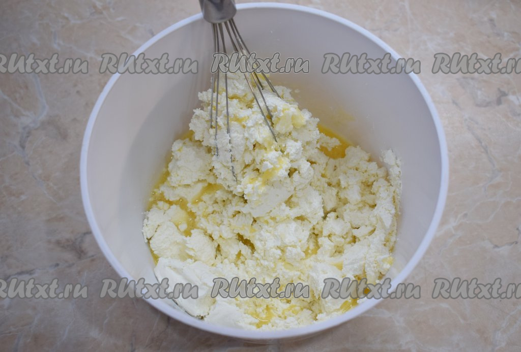 Затем выложите в чашу творог и и перемешайте всё с помощью венчика (или разомните вилкой до однородности). Творог выбирайте мягкий, если он сильно крупинчатый, то его необходимо протереть через сито, чтобы сделать его консистенцию более однородной.