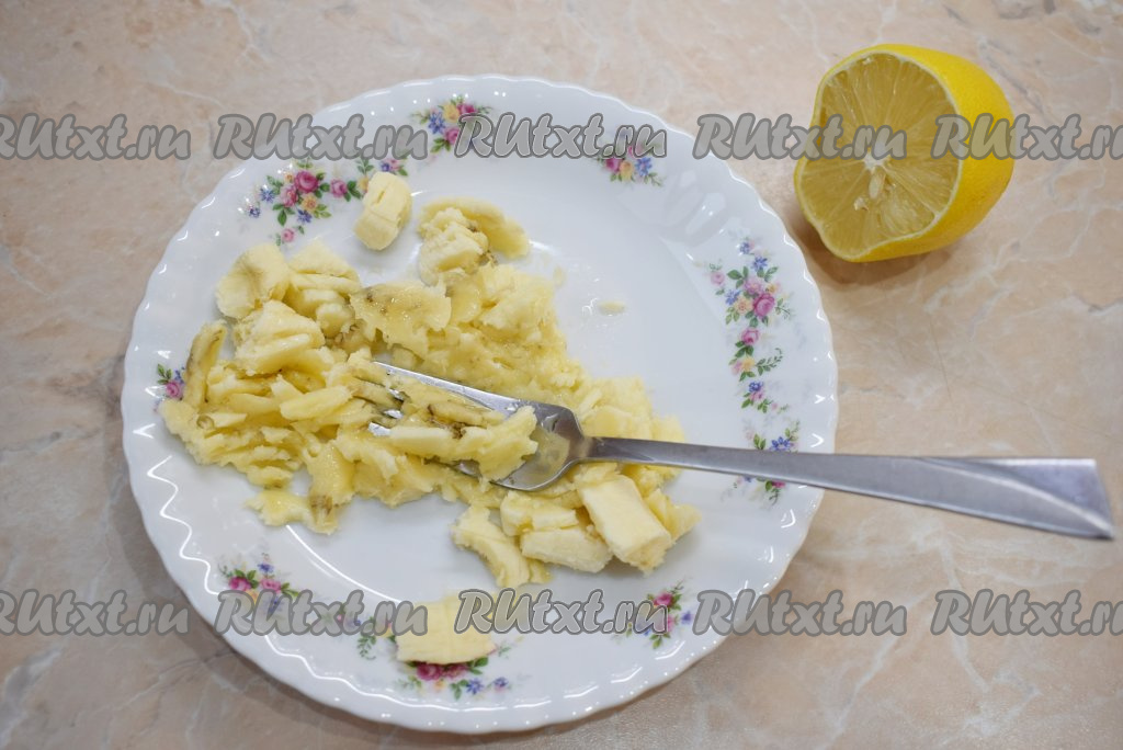 Банан очистите от кожуры и разомните его вилкой. Немного сбрызните размятый банан лимонным соком, чтобы он не потемнел.