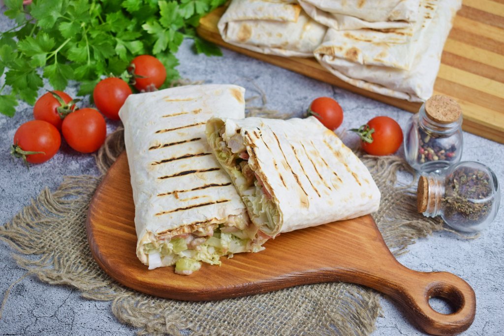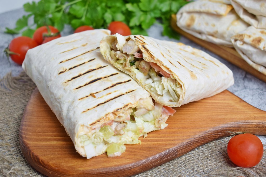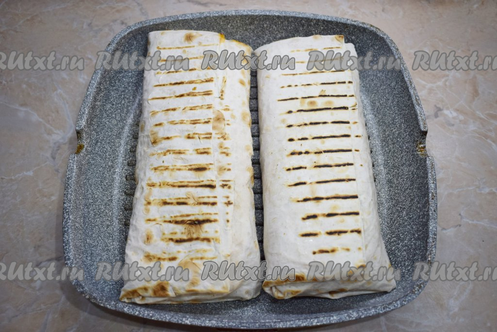 Обжарьте шаурму на горячей сковороде гриль с двух сторон до золотистого цвета лаваша. Сковороду ничем смазывать не надо.