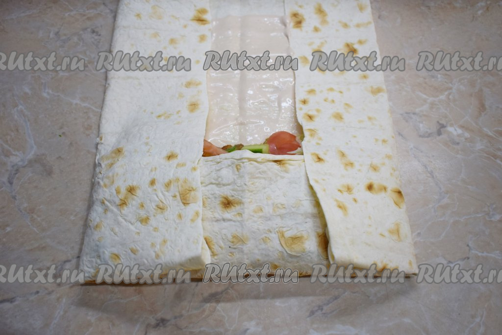 Накройте начинку частью лаваша, после этого подверните края лаваша с двух сторон (как на фото) и сворачивайте лаваш рулетом. Немного прижимайте, делая рулет плоским.