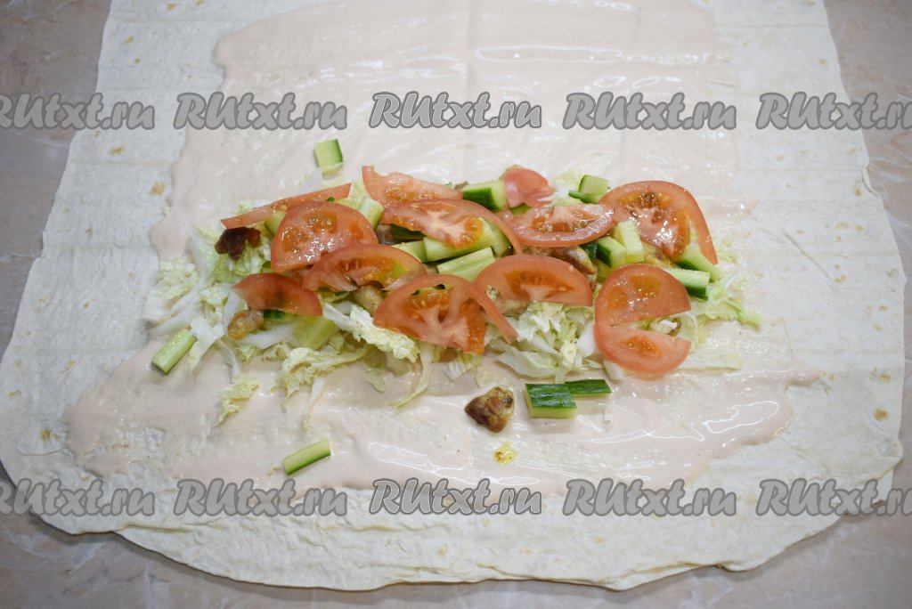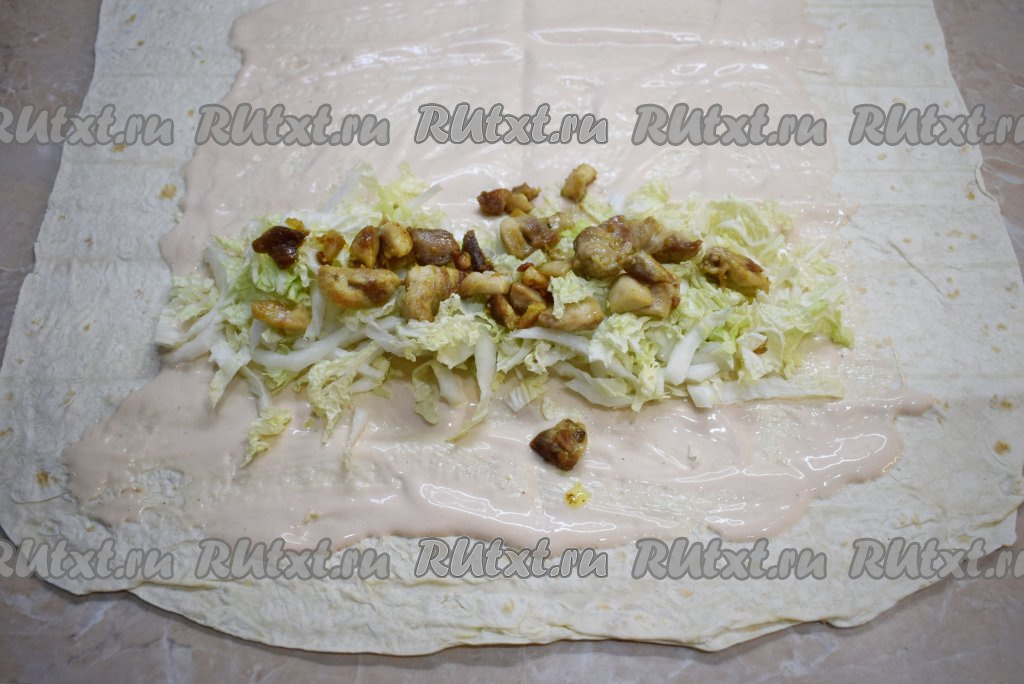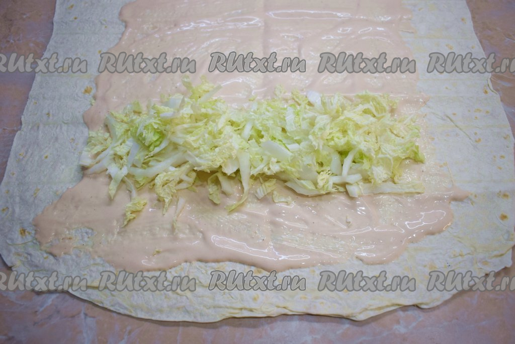 Теперь можно приступать к сборке домашней шаурмы, для этого разложите на столе лист лаваша и смажьте его 1/4 частью получившегося соуса, немного не доходя до краёв лаваша. С одной стороны, отступив от края, выложите 1/4 часть пекинской капусты.