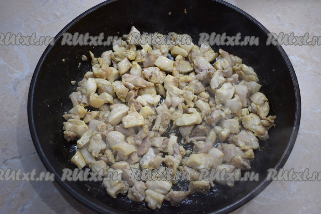 Первым делом необходимо подготовить курицу. Нарежьте куриное филе на небольшие кусочки и обжарьте с добавлением небольшого количества растительного масла до готовности, периодически помешивая, на среднем огне (на это уйдёт минут 15-20). Куриное мясо в процессе обжаривания посолите по вкусу и добавьте к нему немного специй (отлично подойдёт по вкусу, например, карри).