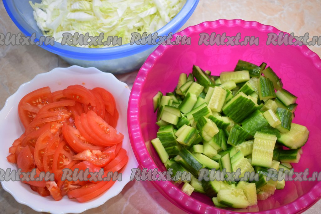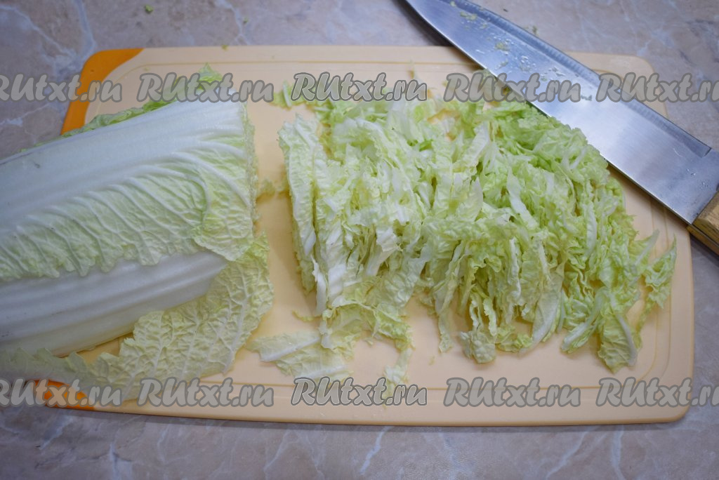 Пока курочка жарится, займитесь подготовкой овощей. С пекинской капусты снимите пару верхних листиков (они нам не понадобятся). Затем разрежьте кочан по всей длине и нашинкуйте.