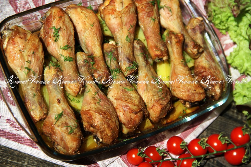 Блюдо готово и можно его сразу подавать к столу. Запечённая картошка пропитывается мясным соком и становится очень вкусной, а куриные голени получаются сочными, с аппетитной корочкой. Рецепт простой и очень удачный, ведь одновременно в духовке готовятся и гарнир, и мясо. Уверена, это блюдо многим придётся по вкусу!