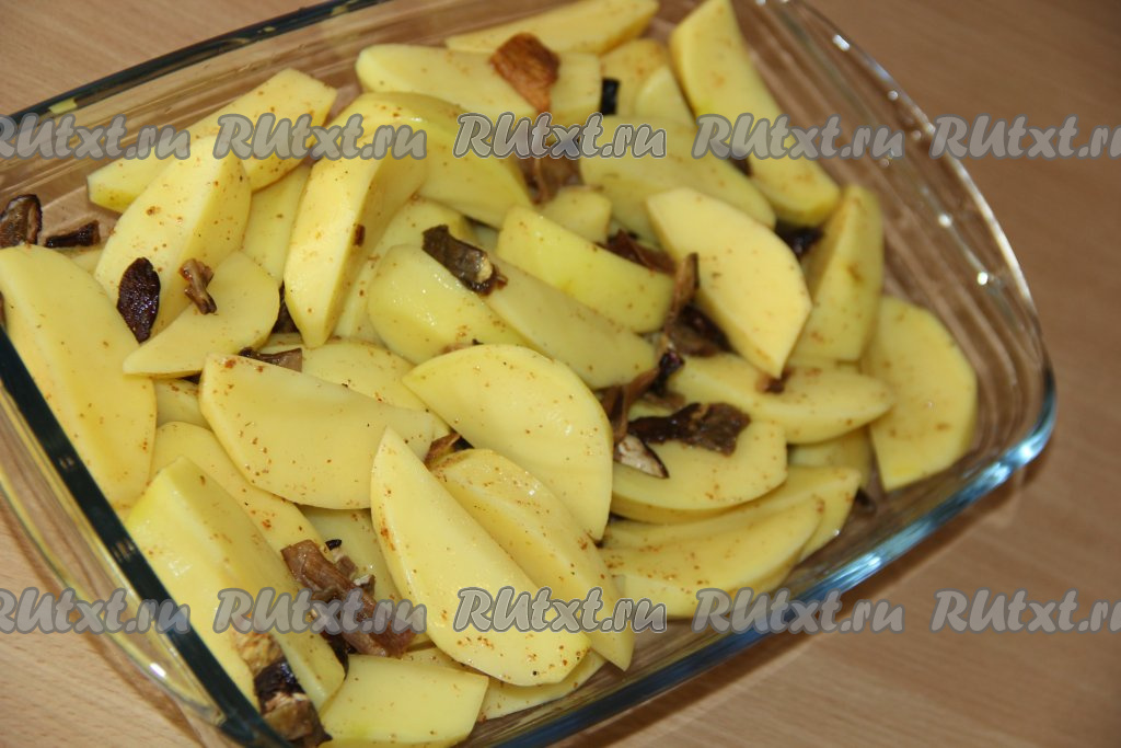 Посолить картошку, можно добавить щепотку специй для картофеля. В жаропрочную форму выложить дольки картофеля и разровнять. Я ещё добавила пару горсточек сушёных грибов (грибы предварительно нужно промыть под горячей водой и мелко нарезать), но грибочки можно и не добавлять.