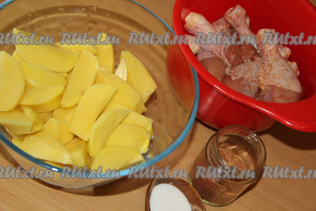 Тщательно перемешать ножки со специями. Оставить на 30 минут. Картофель почистить и нарезать крупными дольками.