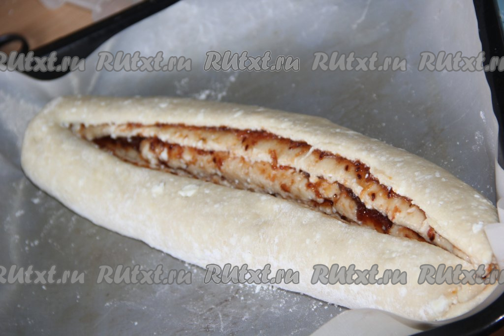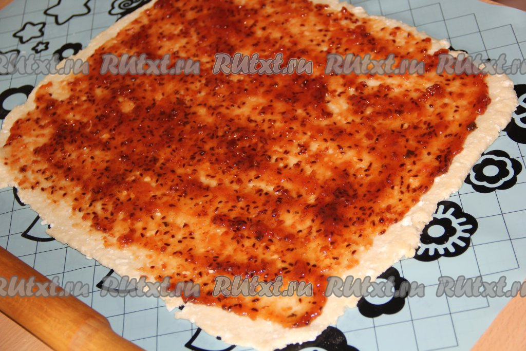 Раскатанный пласт, немного отступив от краёв, смазать вареньем.