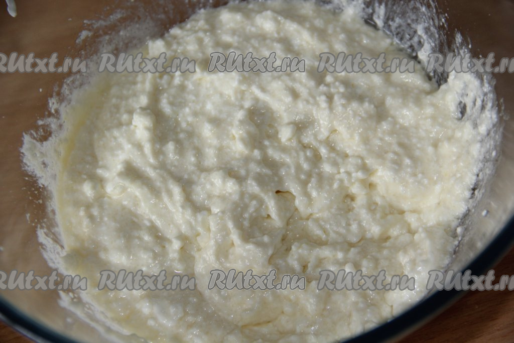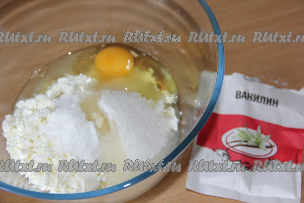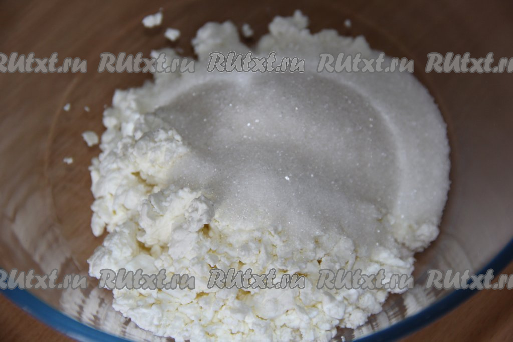 В достаточно глубокой миске соединить творог и сахар.