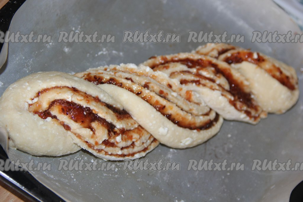 Выпекать творожную плетёнку с джемом в разогретой духовке при температуре 200 градусов, примерно, 45 минут (до золотистого цвета).