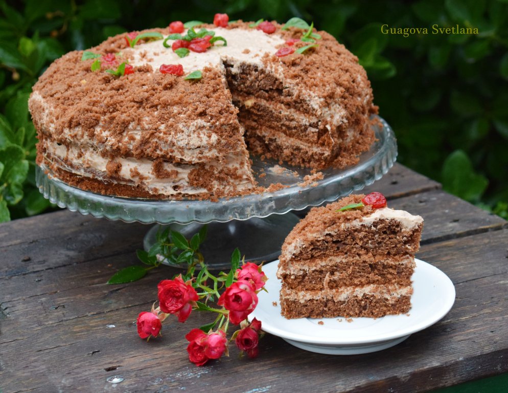 Готовый торт нарезаем на кусочки и подаём к столу. Тортик, несмотря на отсутствие пропитки бисквита, получается влажным, нежным и очень вкусным. Приготовьте этот замечательный шоколадный торт с чиз кремом, хоть он и выходит большим, но вряд ли задержится у вас надолго!