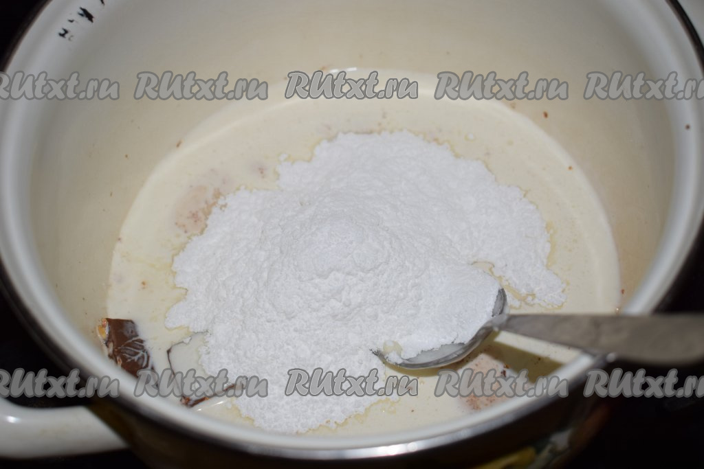К сливкам и шоколаду добавляем сахарную пудру и ставим кастрюлю на огонь. Растапливаем шоколад и сахарную пудру в сливках в течение пары минут на среднем огне.
