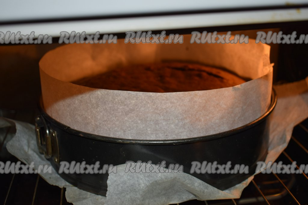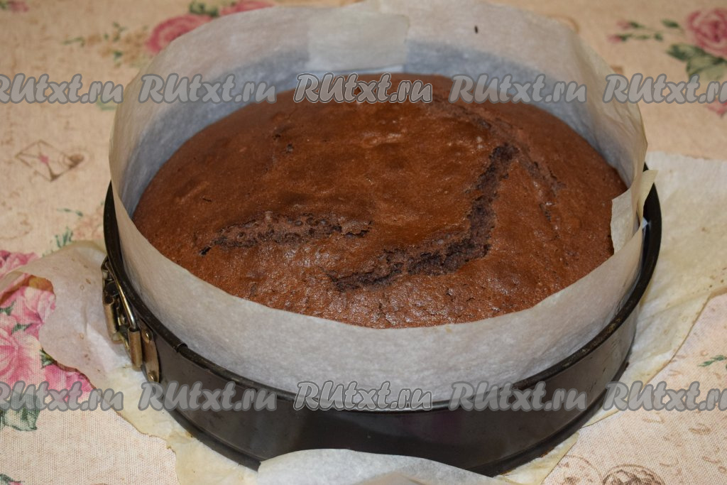 Далее отправляем форму с тестом в разогретую духовку и выпекаем шоколадный бисквит при температуре 180 градусов, примерно, 50 минут. Готовность теста проверяем деревянной шпажкой. Если шпажка выходит из коржа без следов теста, то наш корж готов.