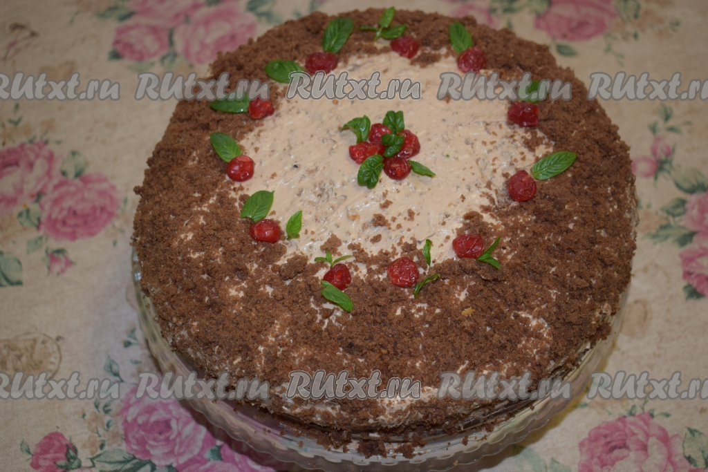 Начинаем украшать наш торт. Покрываем бока торта бисквитной крошкой. Также посыпаем верх торта шоколадной крошкой, не задевая центр. Вокруг не посыпанного крошкой участка раскладываем листочки мяты и сушёную вишню. В центре делаем цветочек из сушёной вишни, украшаем его мятой. Наш шоколадный торт с чиз кремом готов. Отправляем его в холодильник на 7-8 часов для пропитки.