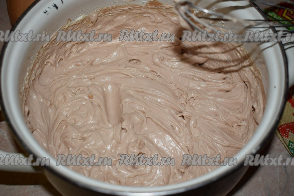 Далее достаём охлаждённые шоколадные сливки из холодильника и взбиваем при помощи миксера в течение 7-8 минут (до загустения).
