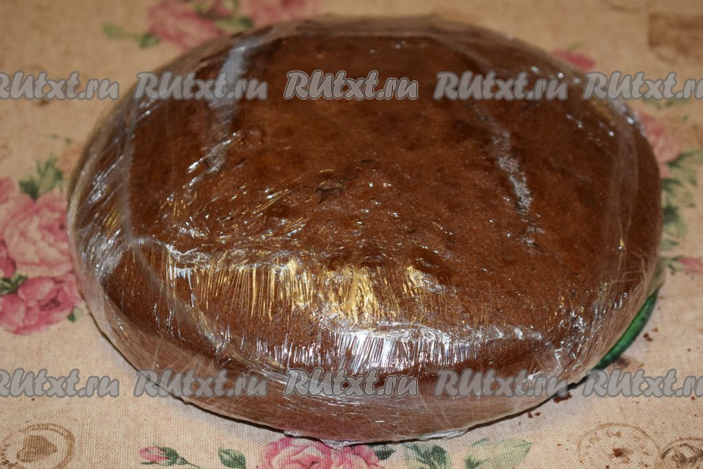 Горячим заворачиваем бисквитный корж в пищевую плёнку, не допуская щелей. Делаем мы это для того, чтобы бисквит напитался своим паром и стал влажным, не требующим дополнительной пропитки. Оставляем корж созревать в плёнке на 5-7 часов.