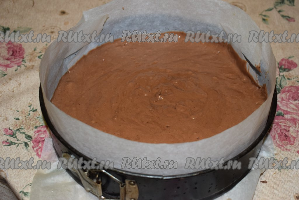 Форму диаметром 26 см выстилаем пергаментом, покрывая дно и бока формы. На пергамент выливаем тесто и пару раз стучим формой об стол (стучать нужно для того, чтобы тесто равномерно распределилось).