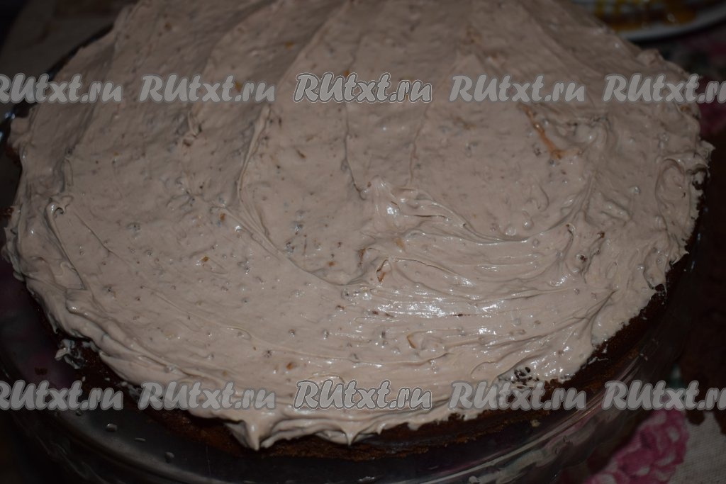 На блюдо, на котором будем собирать торт, кладём первый шоколадный корж и наносим на него слой чиз крема, накрываем вторым коржом, тоже смазываем кремом, сверху выкладываем третий корж. Верх торта и бока тоже покрываем кремом.