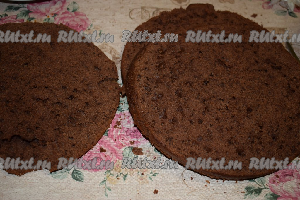 Остывший бисквит разрезаем на 3 части при помощи длинного ножа. Затем ножом проводим по поверхности коржей, соскребая рыхлую бисквитную крошку (этой крошкой мы украсим торт сверху).