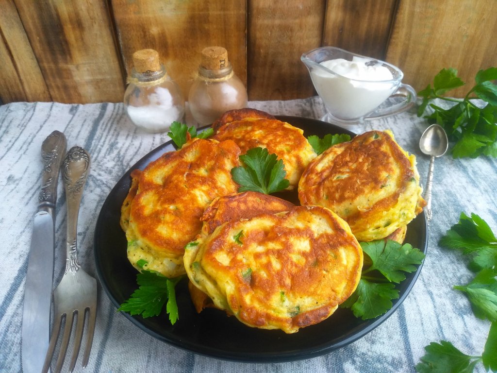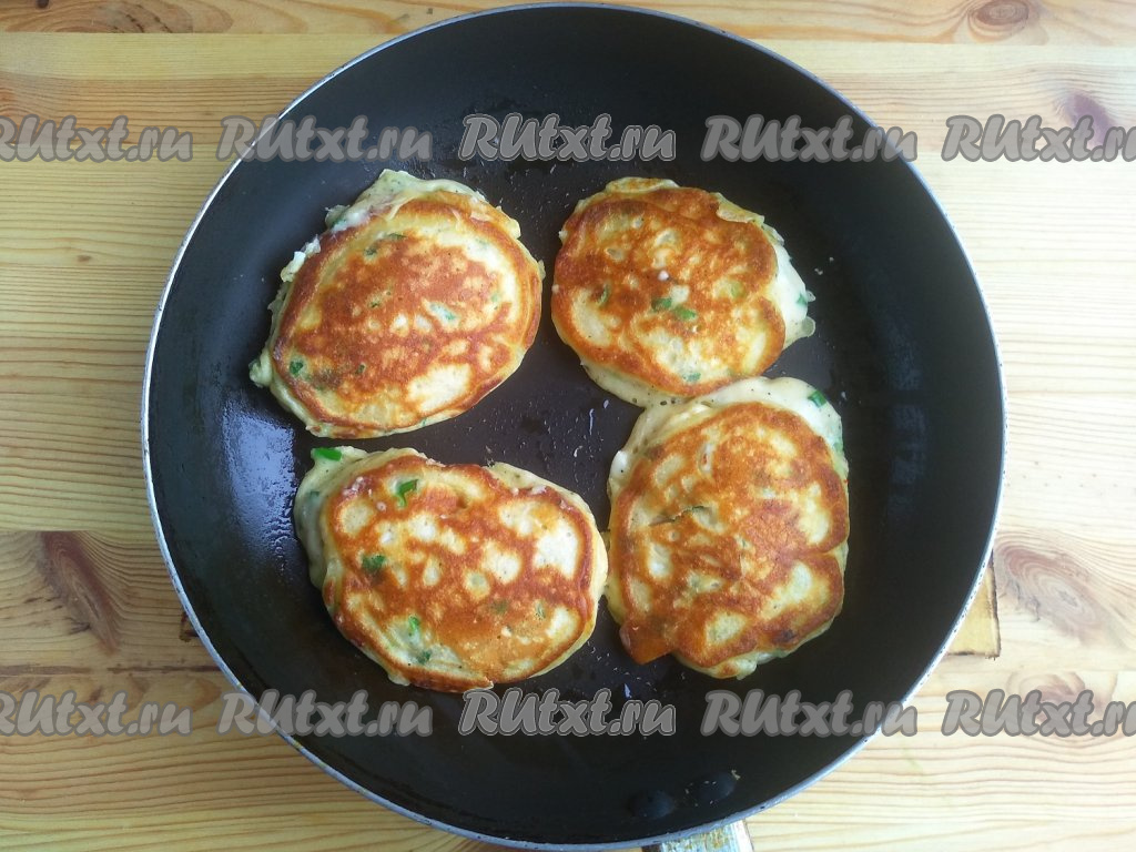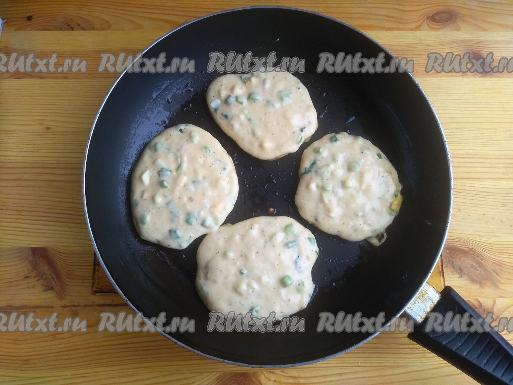 Сковороду разогреть с небольшим количеством растительного масла, выкладывать по 1,5 столовые ложки теста в виде оладий и жарить на среднем огне до золотистого цвета.