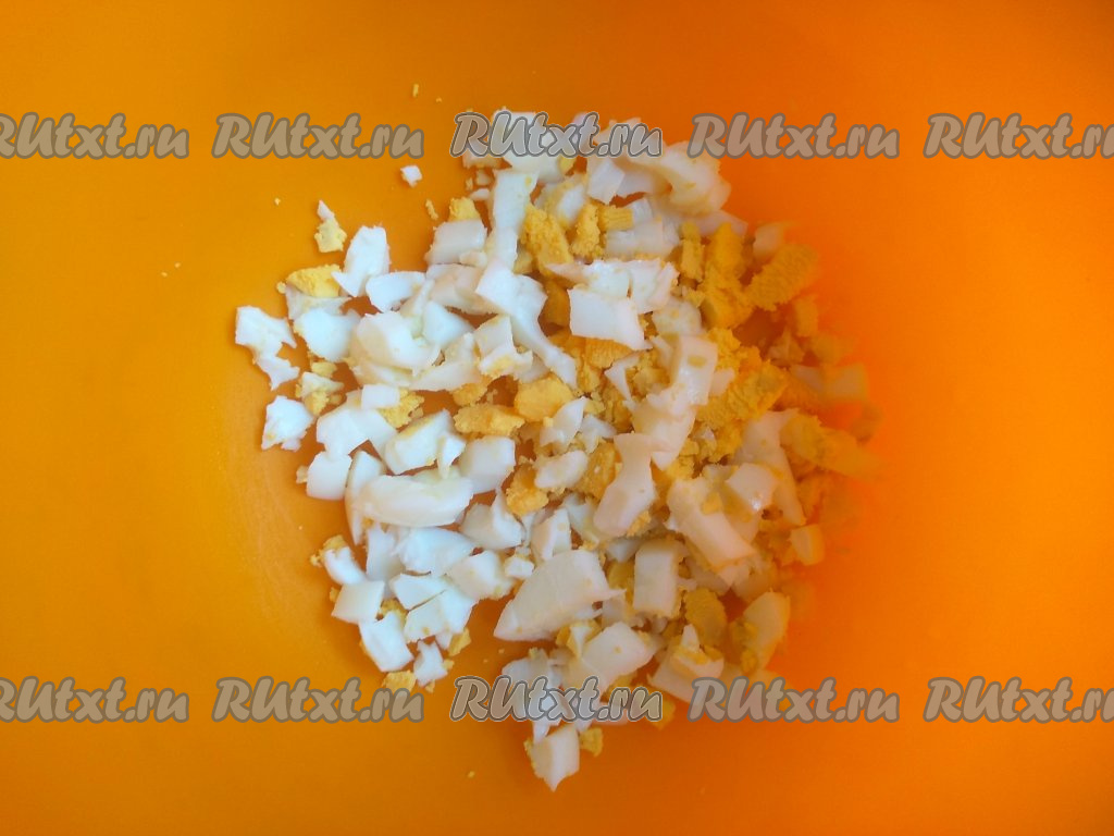 Одно яйцо отварить вкрутую (варить 8-10 минут с момента закипания воды), охладить. Очистить остывшее яйцо от скорлупы, нарезать достаточно мелко.