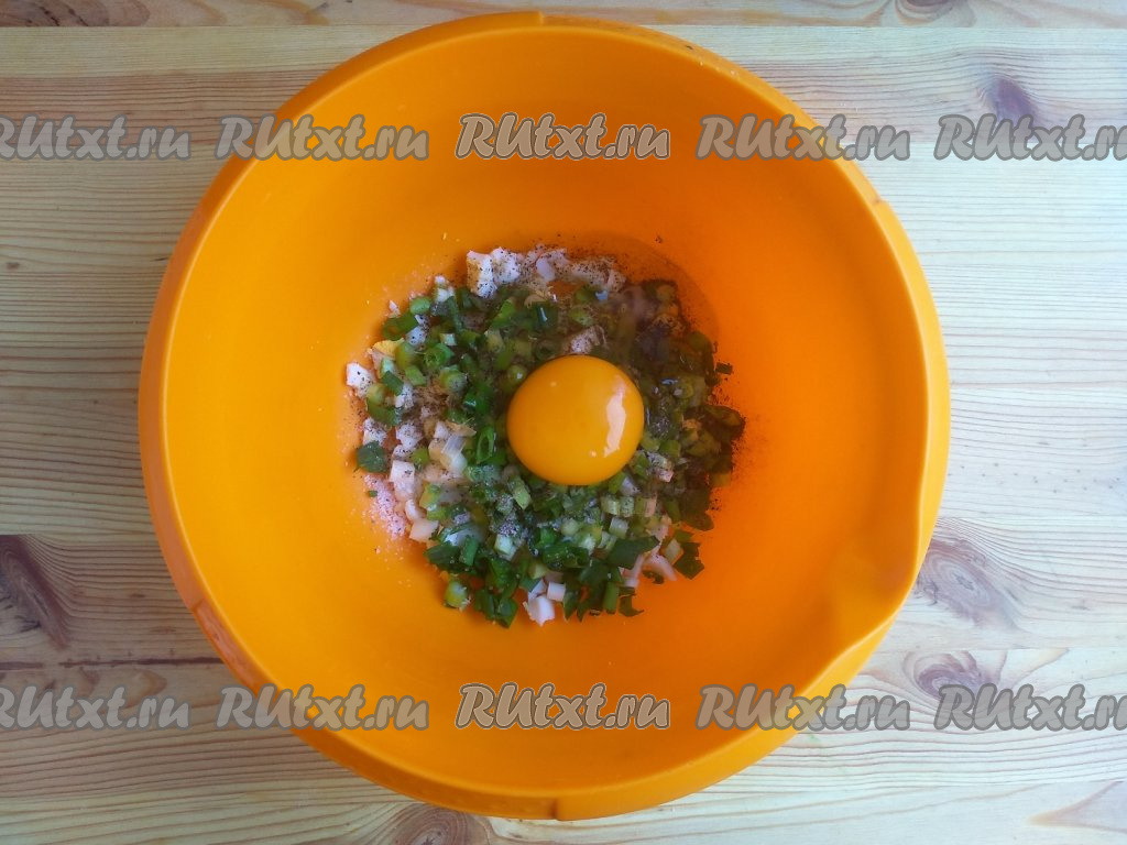 Добавить сырое яйцо, затем посолить и поперчить по вкусу.