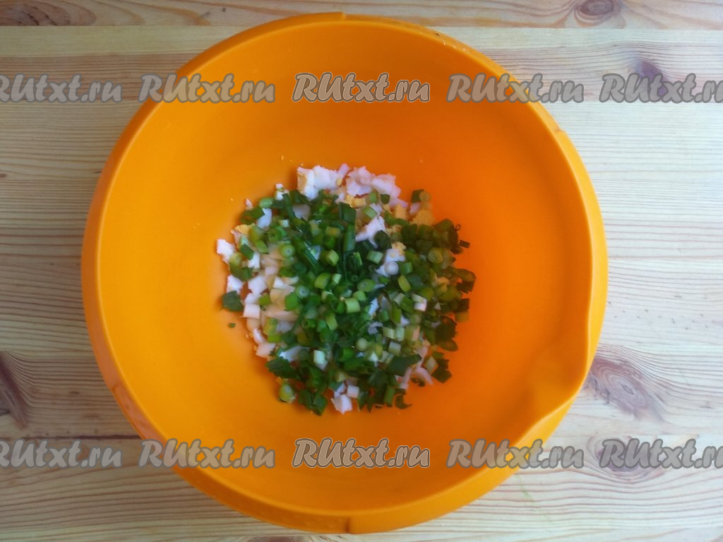 Зелёный лук промыть, обсушить на полотенце, мелко нарезать. Нарезанное яйцо и лук выложить в миску.