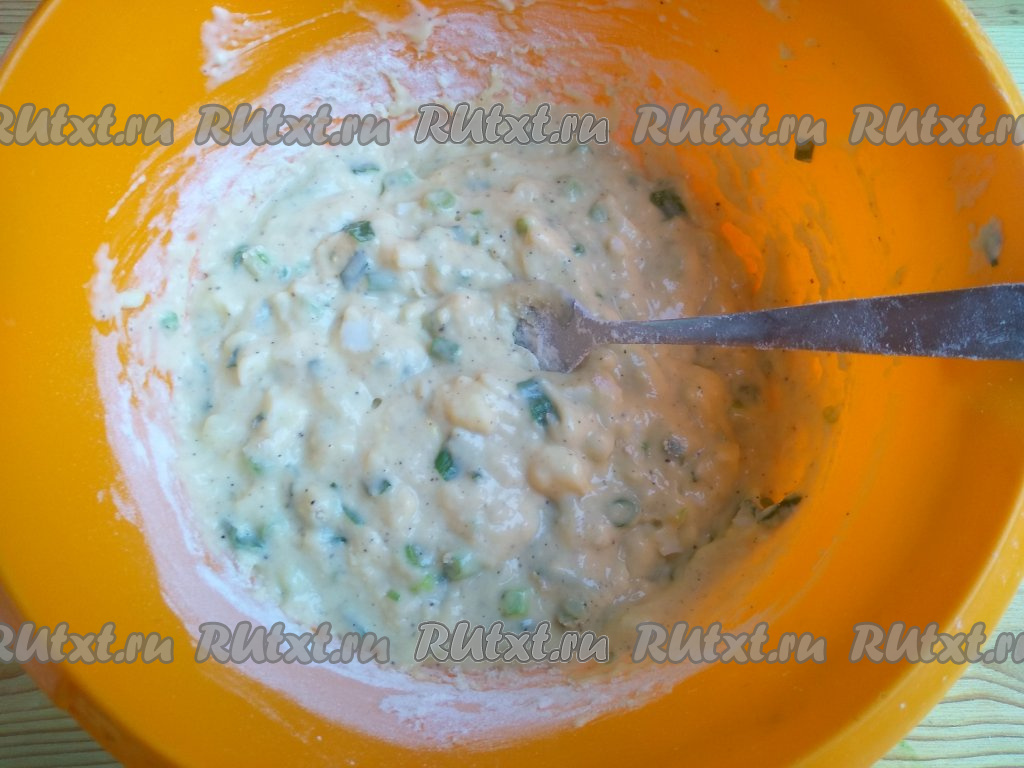 Тесто больше не перемешивать. Тесто для приготовления ленивых пирожков должно получиться в меру густым.