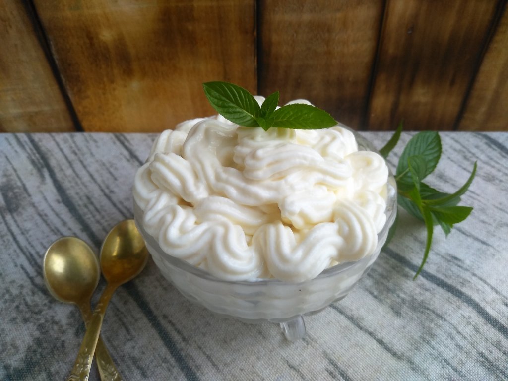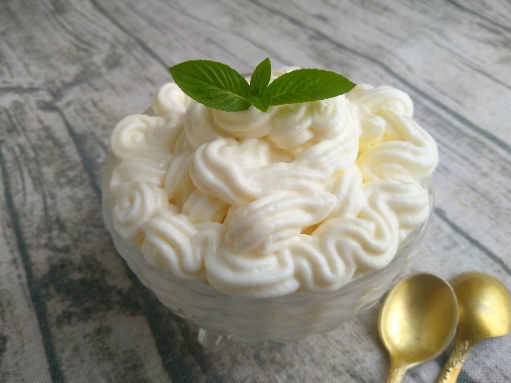 Повторно взбить массу блендером. Наш творожно-йогуртовый крем готов. Он отлично подойдёт для украшения кондитерских изделий (для этого его нужно выложить в кондитерский мешок и отсадить на изделия). Его можно использовать в качестве прослойки для тортов или других десертов. У крема устойчивая структура, он не течёт и сохраняет свою форму. Он средне-сладкий на вкус с лёгкой кислинкой. Можно его подать к столу и в качестве самостоятельного десерта.
