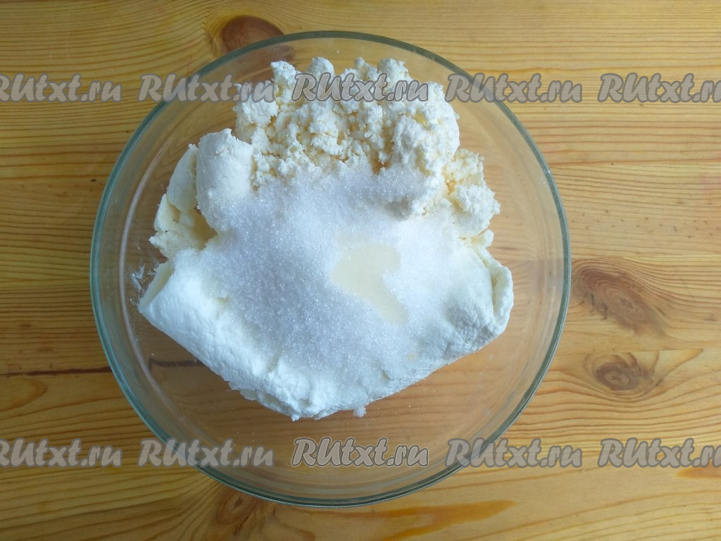 Добавить к творогу и йогурту сахар и ванильный экстракт (экстракт добавляем по желанию).